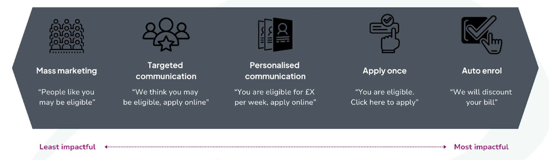 All three approaches are more impactful than traditional mass marketing awareness campaigns. Auto Enrol is the most impactful, with the Warm Home Discount delivering energy support automatically to the vast majority of eligible households (92% in 2023-24) as a model of automation that can and should be built on.