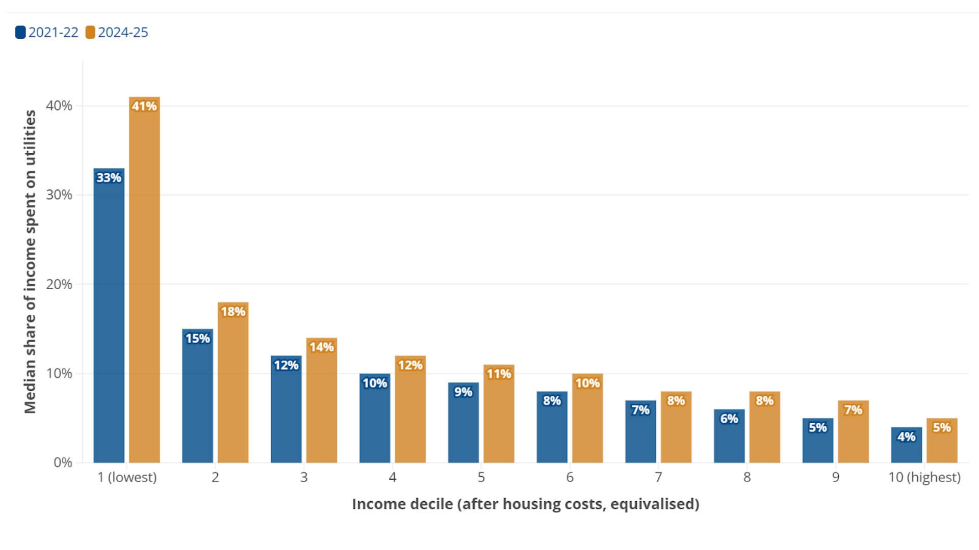Households in the lowest equivalised income decile are spending around two fifths (41%) of their disposable income (after housing costs) on energy, water, broadband and car insurance bills - compared to 11% for those in the fifth decile and 5% for those in the tenth decile.