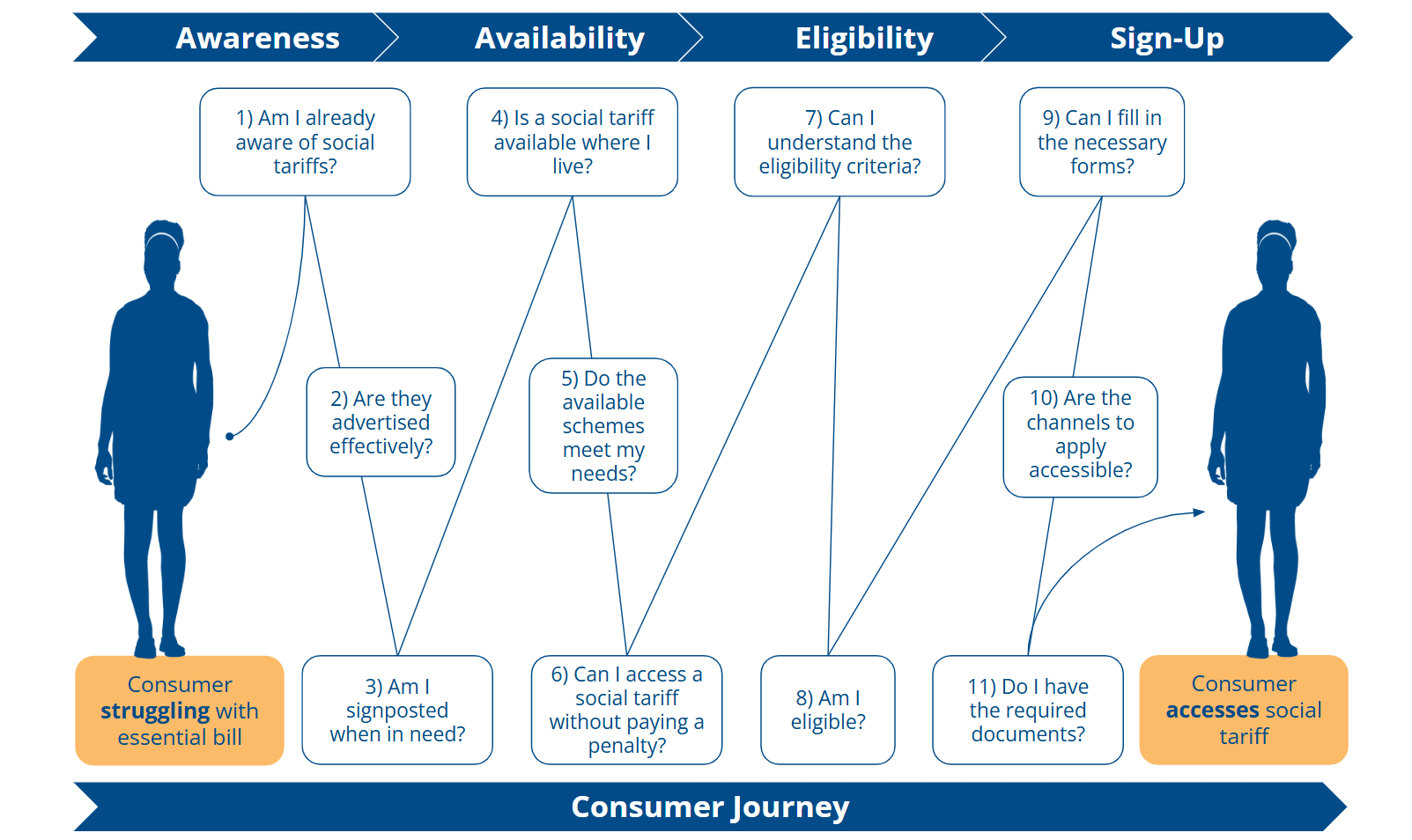 The consumer journey for applying for existing water and broadband social tariffs is fraught with barriers that prevent many from accessing the support they need. 11 barriers in total are identified, across four key stages of the consumer journey: awareness, availability, eligibility and sign-up.
